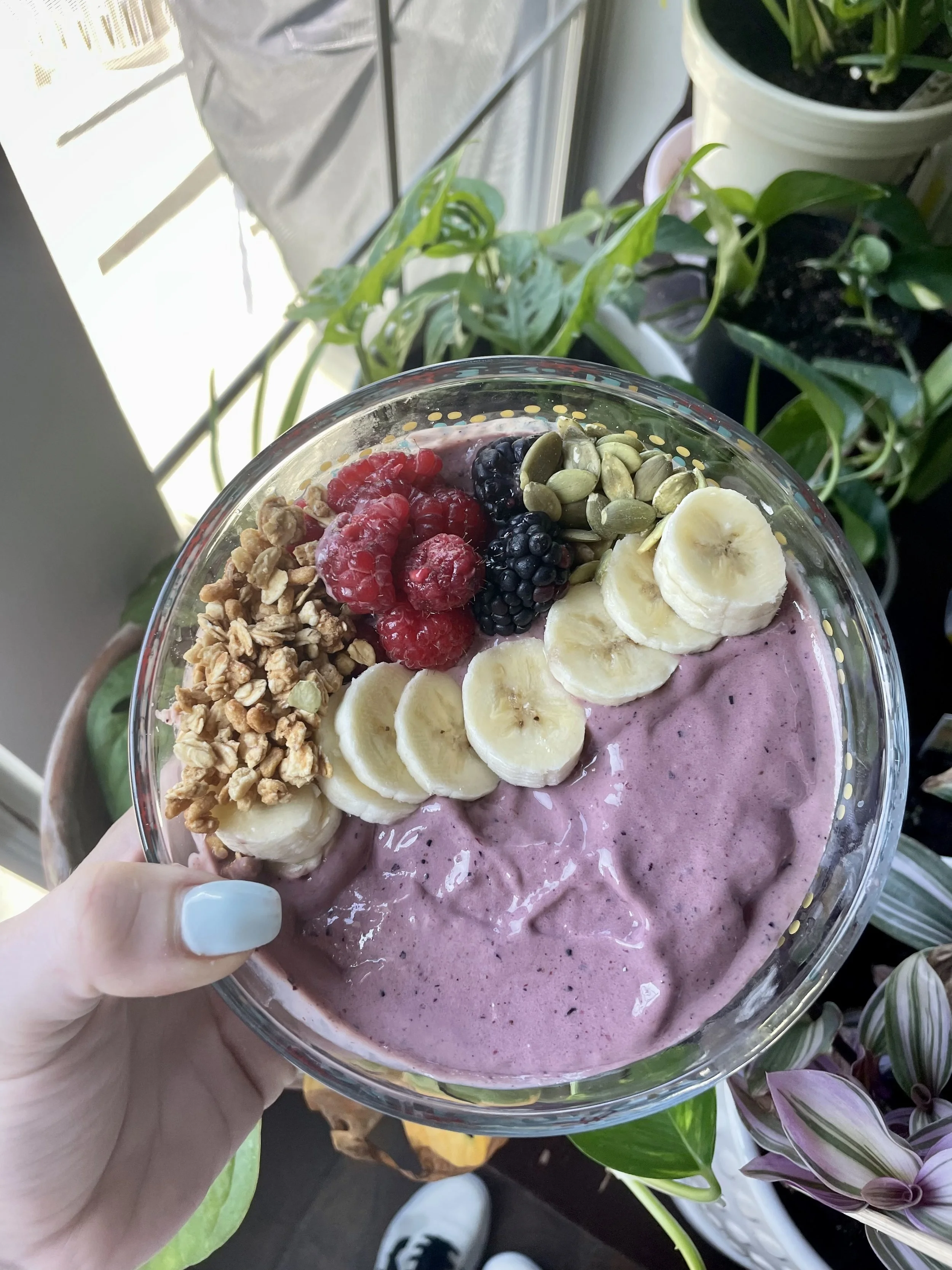 The original one I had was a base of banana, pitaya, and peanut butter. It was HEAVENLY! However, my favorite grocery was sold out of frozen pitaya, so I opted for an OG ACAI BOWL! After seeing them sold for anywhere from $10-15 a bowl, I had to give it a try at home!